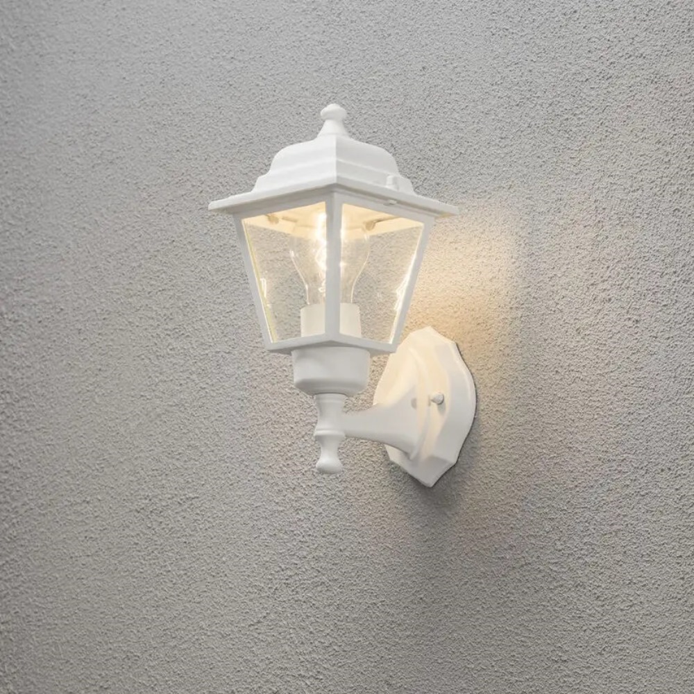 Vägglykta vit med IP23 klassning från Konstsmide i lackad vit aluminium. Vägglyktan har en tidlös, traditionell design och är idealisk för att ge en välkomnande belysning vid entréer, garage eller på altanen. Rekommenderad ljuskälla: E27, max 60W. Ljuskälla ingår ej.
