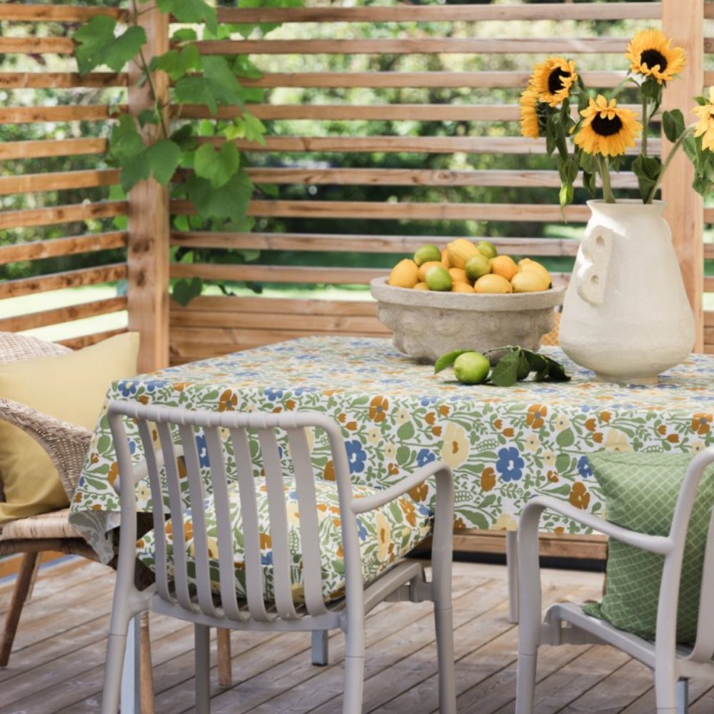 Retroinspirerat mönster i bomull med praktisk akrylatbehandling. Ger liv åt bordet med ett mjukt fall, perfekt för kök, uteplats och sommarstuga.